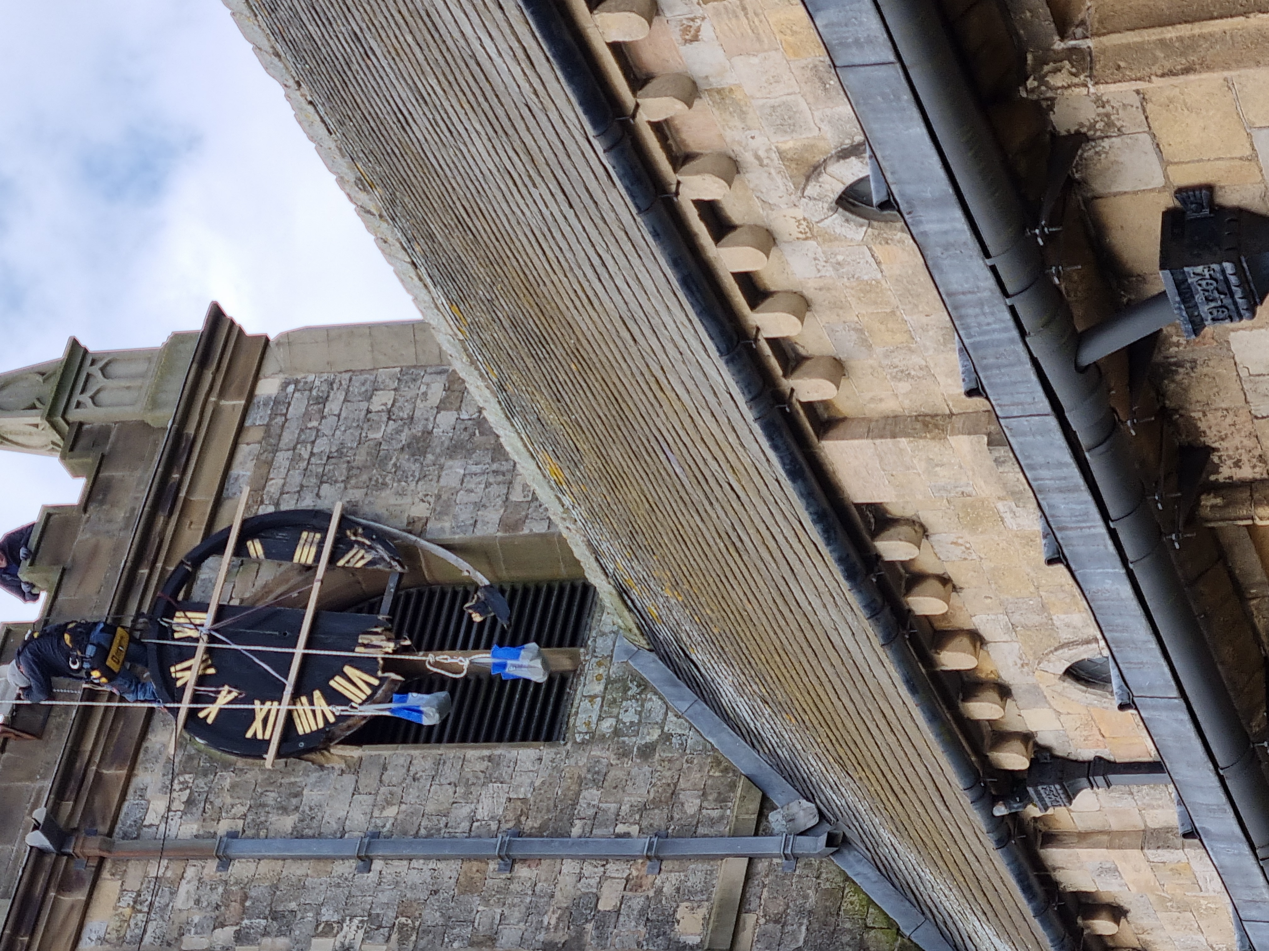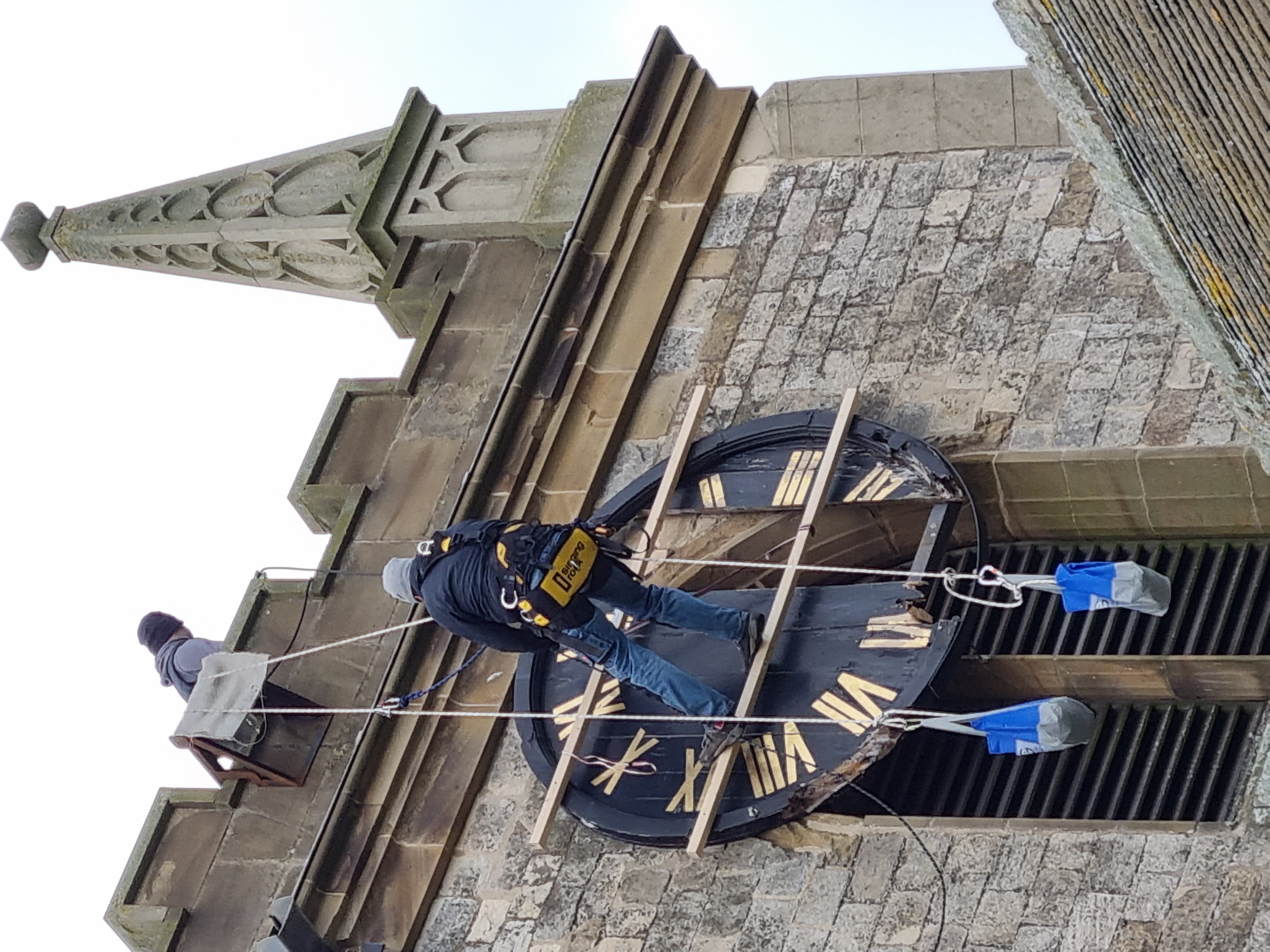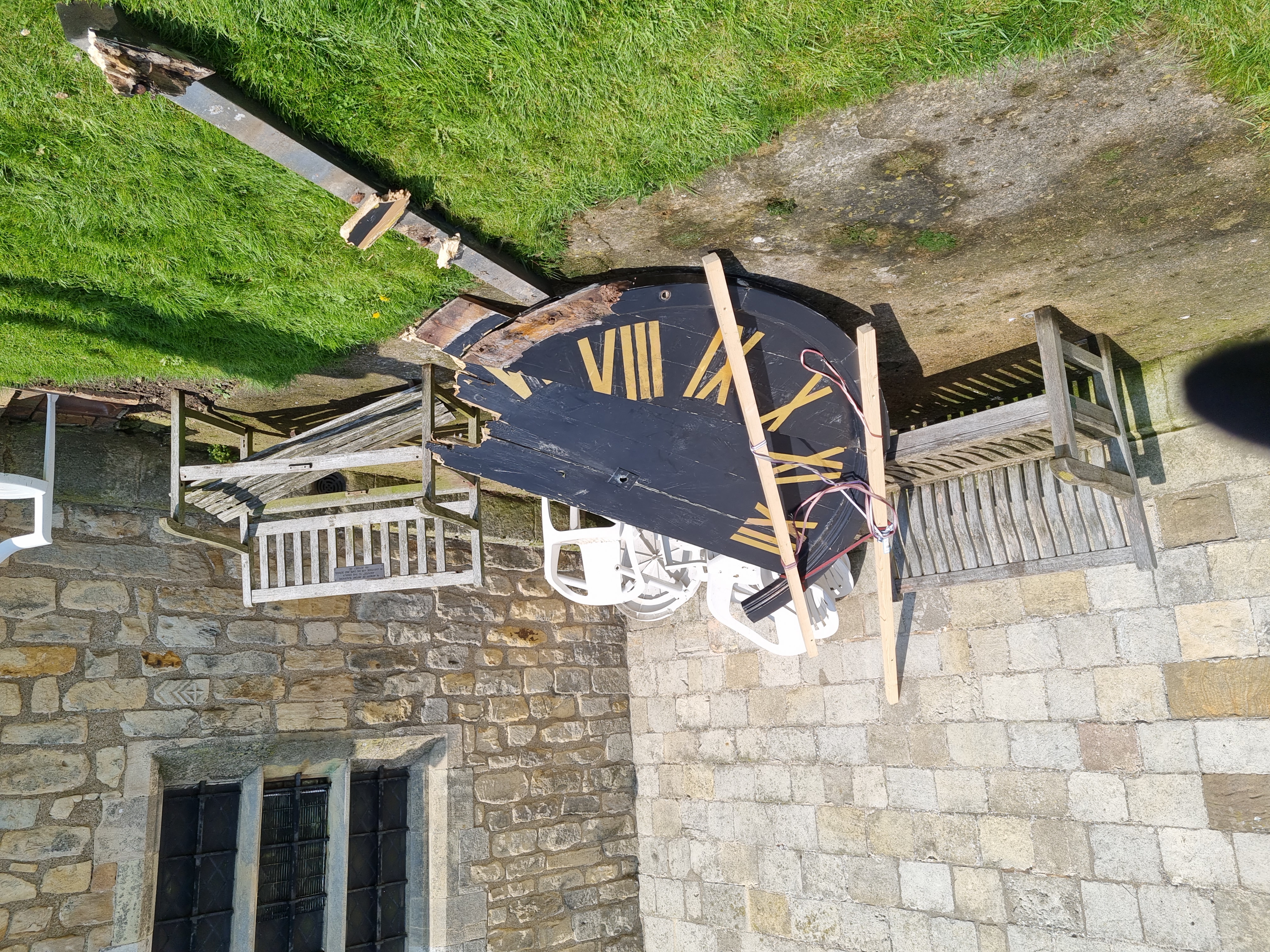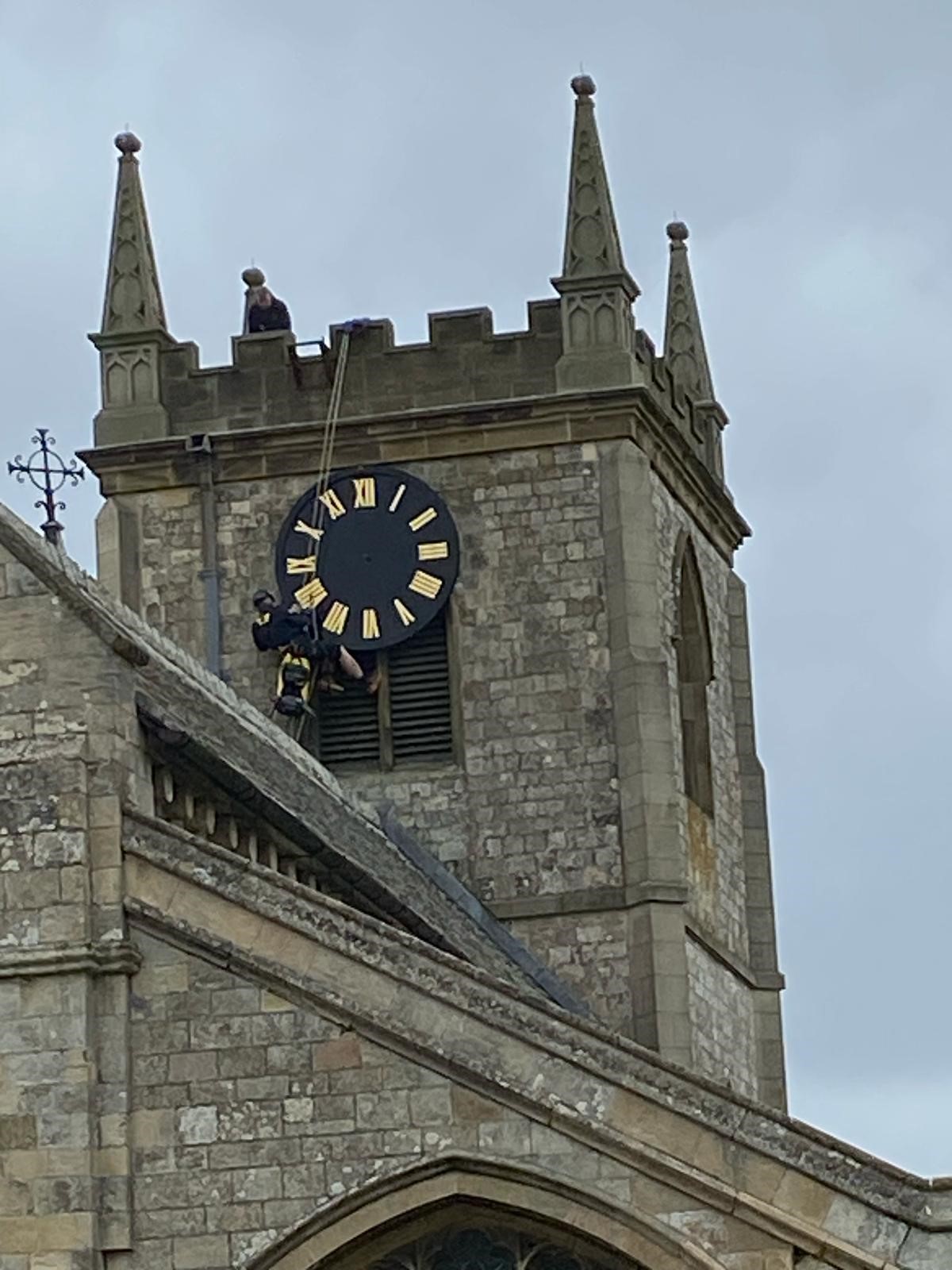 The clock on the priory church of St Mary began to show signs of deterioration over the summer of 2021. The outer circular ring of the clock face was showing signs of severe rot, leading to the loosening of the vertical panels.